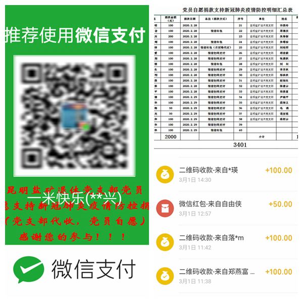 银发映丹心,捐款助抗。在全民疫情防控阻击战中,公司退休党员用实际行动助力疫情防控,关键时刻彰显担当本色。昆明盐矿退休党支部积极响应昆明盐矿党委的号召,自愿捐款支持新冠肺炎疫情防控,在短短的时间里,党支部共收到38名退休党员捐款3401元。支部委员通过工作联系群第一时间传达公司党委《关于组织党员自愿捐款支持新冠肺炎疫情防控工作的通知》精神,在不断接到退休党员询问如何捐款的电话后,为方便党员及时捐款,支部召开支委会决定由支部书记代收,在群内上传党员捐款二维码后,便开启了爱心接力模式,50元、100元……党支部书记的手机不断收到微信播报“捐款**元”、“助力疫情,武汉加油”等语句,句子简短,却承载着一个个退休党员质朴而真诚的爱心。