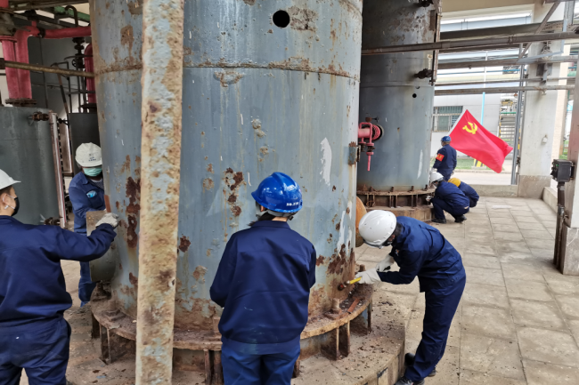 活动以小组为单位对转化工序所划分的责任区进行设备除锈。活动现场大家分工明确、配合默契、干劲十足,用手中的工具将一块块腐蚀严重的铁锈刮落、磨掉。