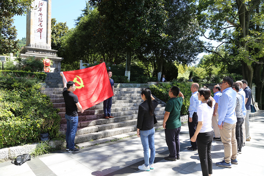 踏寻着红军长征的足迹,集体参观了扎西纪念馆、烈士陵园、扎西会议会址、水田会议会址。一件件珍贵的红军文物,一幅幅峥嵘岁月的照片,一桩桩感人至深的故事,生动地重现了革命先辈生不怕流血牺牲的革命精神。“秋风送花表哀思,青松滴翠寄深情”,迎着朝阳,全体党员瞻仰烈士纪念碑,敬献花篮,缅怀先烈,面对着鲜红的党旗,党员同志们庄严地举起了右手,握拳宣誓,重温了入党誓词。